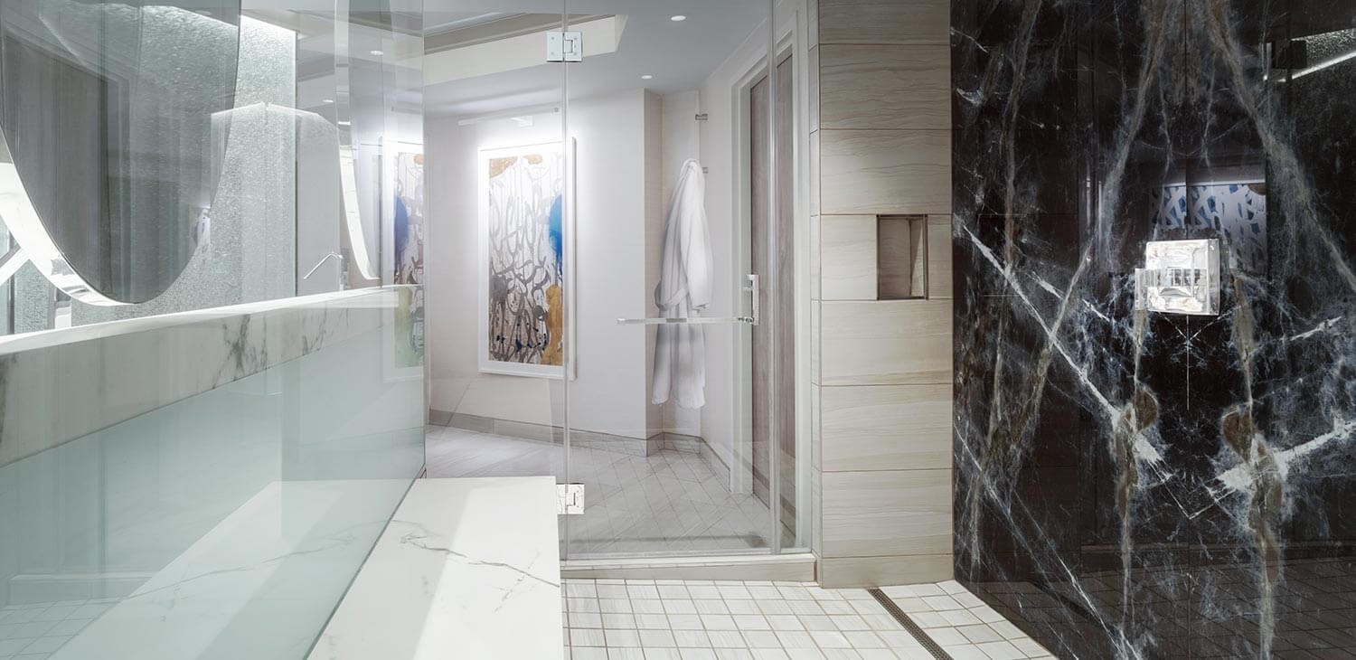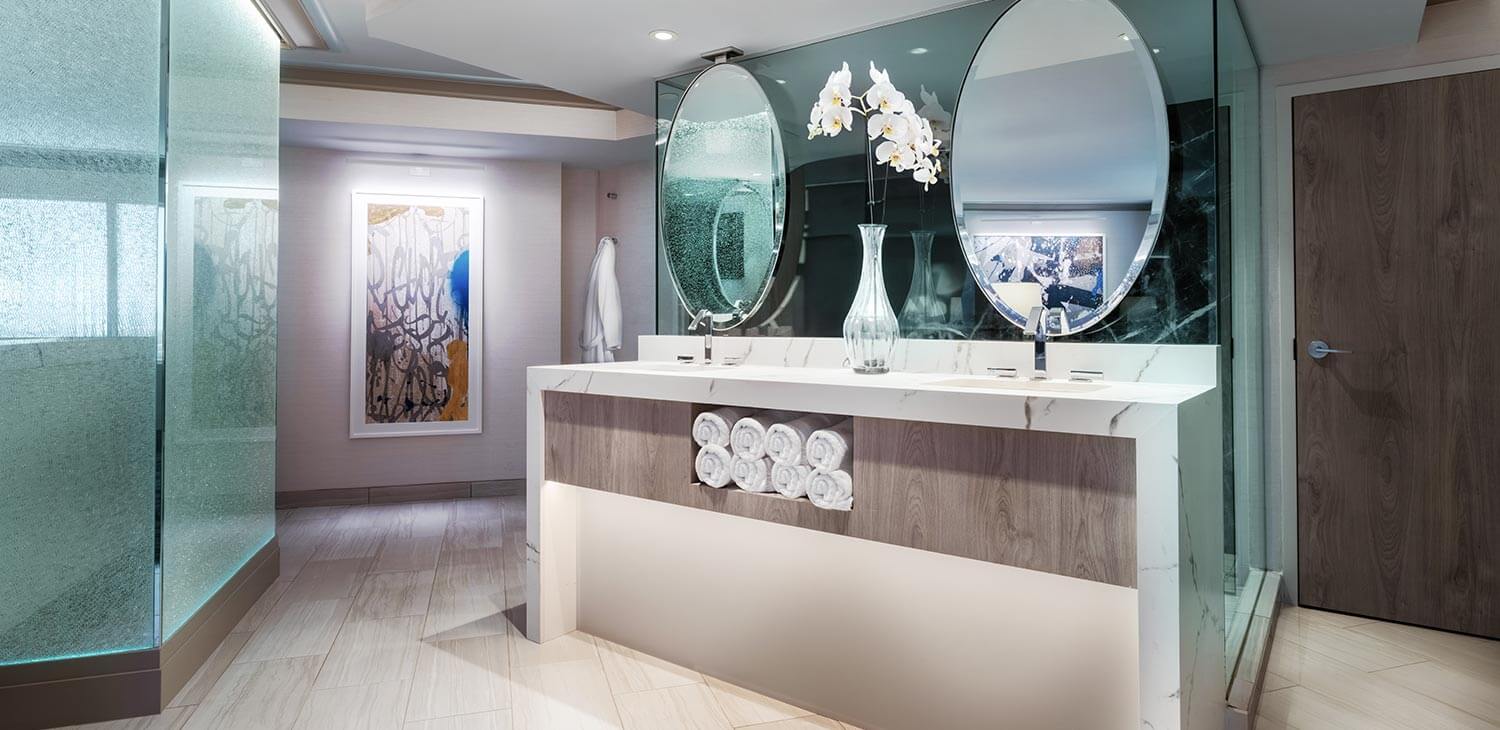 With an open floor design, this room will feel larger than the one back home. Vanity shower, lounge area, wet bar, and luxurious king bed may convince you to extend your Vegas trip a little longer.